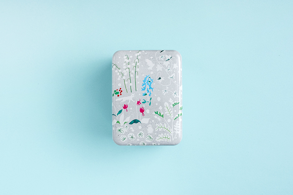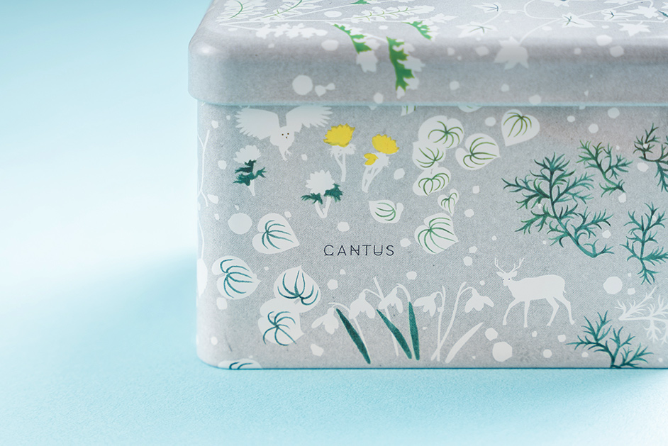 クッキー缶のイラストは、お店のロゴや全商品のパッケージデザインを手がけるクリエイティブユニット KIGIによるもの。寒さの厳しい北の大地で元気に遊ぶエゾシカ、雪を割って咲く山ユリ……。CANTUSオリジナルの北の妖精も姿を見せて、動植物たちの楽しい銀世界に誘われるよう。