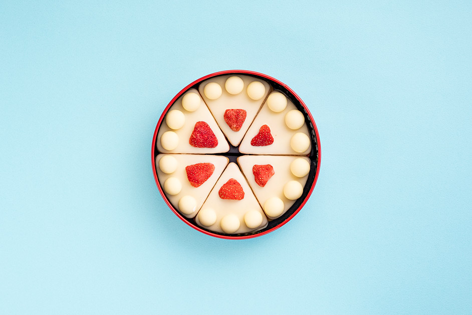 「ケーキサブレ缶 ホワイト」は、お祝いの定番スイーツ・ショートケーキがモチーフ。イチゴやホイップクリームのエンボス加工がキュートな丸缶からしてショートケーキですが、ふたを開けるとさらにテンションアップ。