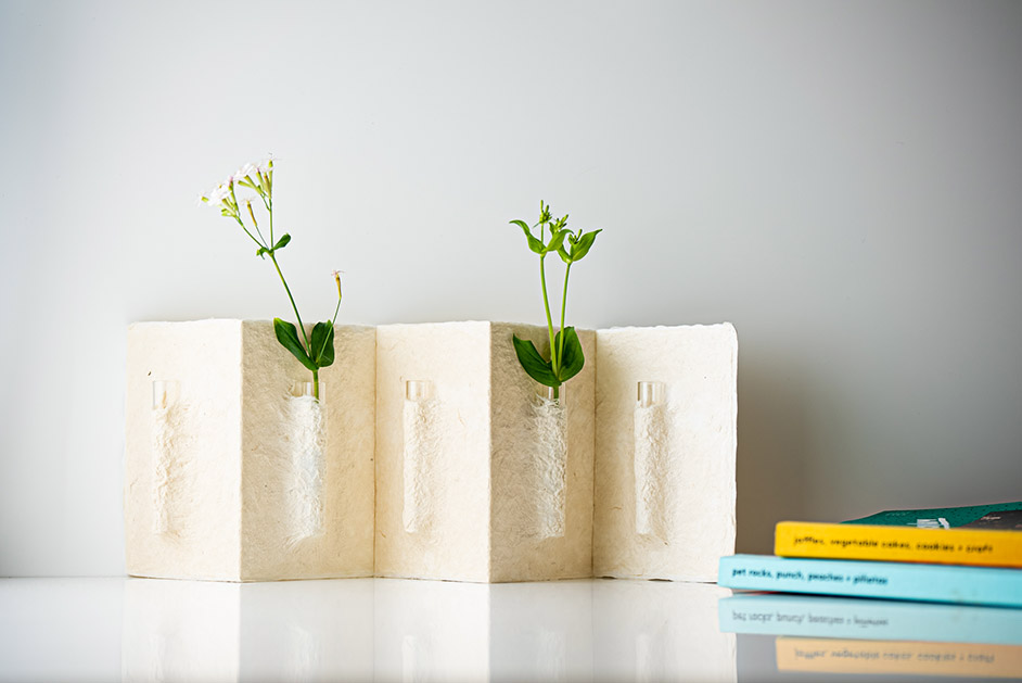 野山に自生する草木を材料に、ひとつひとつ手漉きで作る和紙独特の質感が魅力的。はがきサイズの和紙を連ねたような屏風型の花器は、飾る場所のスペースや雰囲気に合わせて、畳んだり広げたりと自由に調整できます。取り出し可能なガラス管が挿してあるので水換えも簡単。手作業だからこその温かみを感じられる花器は、シンプルなデザインだからこそ、生ける花によってさまざまな表情が楽しめます。