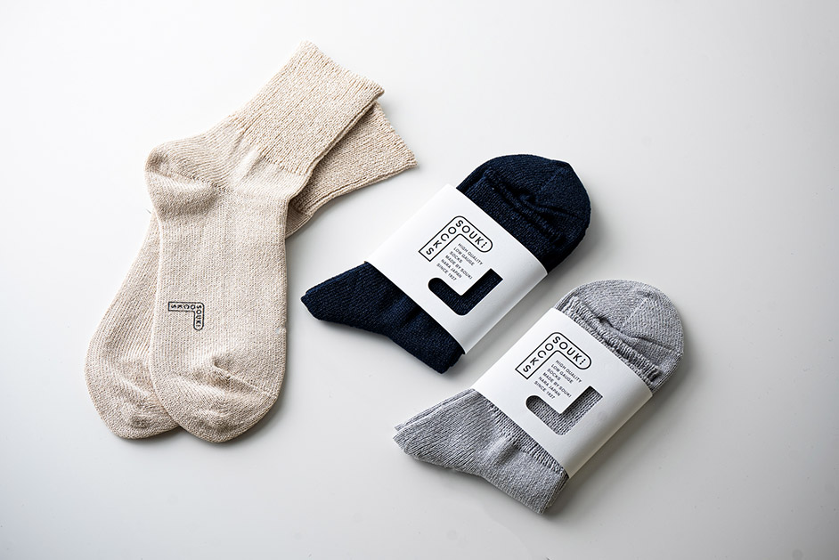 シンプルで上質な履き心地のローゲージソックスブランド「SOUKI」は、1927年創業の靴下工場「創喜」のファクトリーブランド。「日本一ワクワクするくつ下工場になる」という目標に掲げて誕生したプロダクトのひとつが、日本最古の紙、美濃和紙で作る靴下です。吸湿・吸水性が綿の1.3倍高く蒸れにくいため、夏でも快適は履き心地が魅力。洗濯して繰り返し履くたび、生地が柔らかくなっていくのも特徴です。