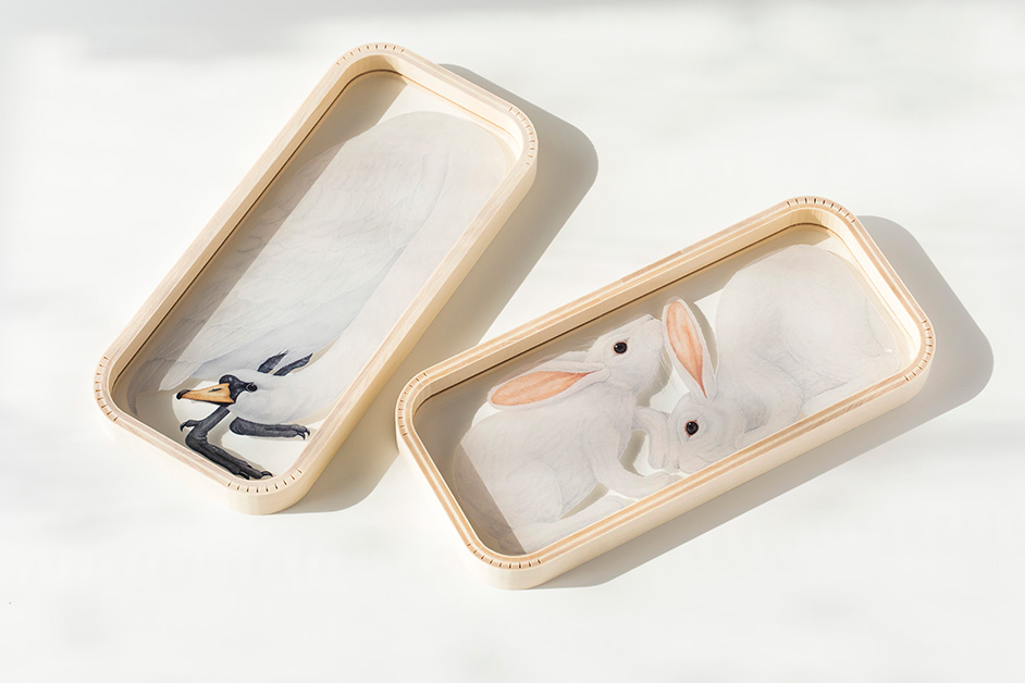 MOHEIMクリエイティブ・ディレクターの竹内茂一郎さん「美しい佇まいながら、どこかユーモラスなニュアンスでフレームにすっぽりと収まったウサギと白鳥のイラストは、毛並みまで繊細に表現されています。トレイの下に落ちる影まで引き立たせることを意識して描かれているところにも注目してください」