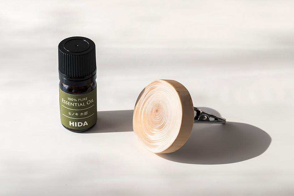表面に精油を垂らすだけで柔らかく香りが広がる、クリップ型ディフューザーとヒノキのエッセンシャルオイル。「家具には使えない木材や山を守るために枝打ちされた枝葉まで余すことなく森の恵みを届けたい」そんな想いから、天然木の枝を活用して誕生しました。精油は、飛騨地方のヒノキ木部を高圧水蒸気蒸留法で抽出した100%天然・無添加。木々そのものの力強さを感じる香りで、まるで森林浴をしているような心地いい空間に。