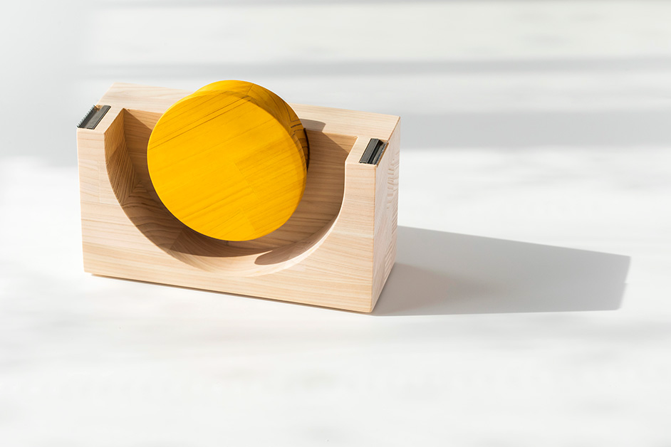 黄色い丸がパッと目を引く積み木のようなデザインのテープカッターは、ほんのりと染まった桜色の色合いと、爽やかな香りが特徴の四万十ヒノキの集成材で作られたもの。集成材とは、原木の製材で生じた端材や曲がり材、間伐材など従来なら捨てられていた材同士をつなげあわせた素材のことです。ずっしり重く安定感があり、左右にカッターがついているので右手でも左手でも使えるのも嬉しい点。黄色い丸以外は無塗装なので、木そのものの手触りも楽しんで。