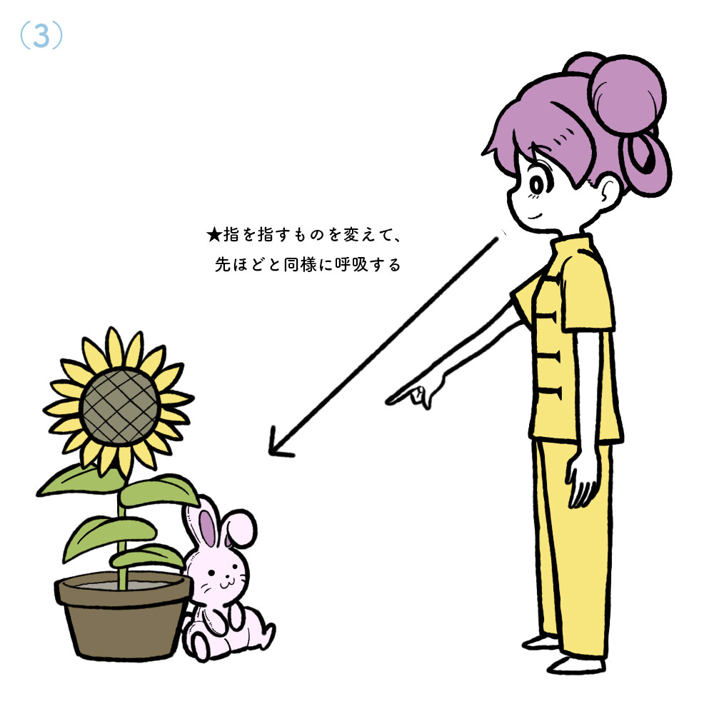 | 3) 1の的に向かって3回呼吸をしたら、指差す的を別のものに変え、同様に呼吸を行なう。 これを3回程度繰り返す。 |