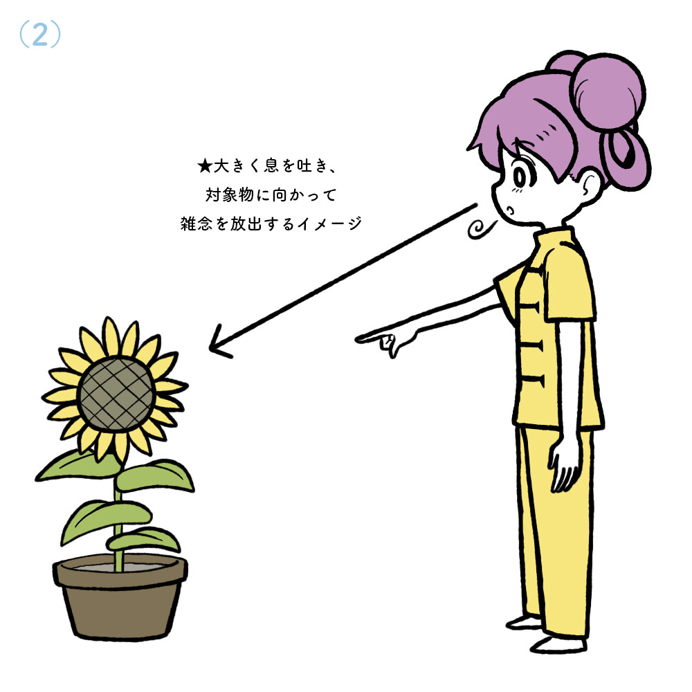 | 2) 1の的に向かって体内の雑念や悪いエネルギーを放出するイメージで、ゆっくりと大きく呼吸をする。 |