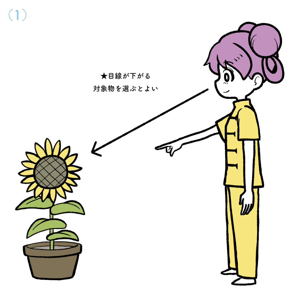 | 1) 部屋の中にある時計やテレビ、植木鉢など、視線の的になるものを1点決めて指を差す。 自身の視線より下の位置にあるものを選ぶのがおすすめ。 |