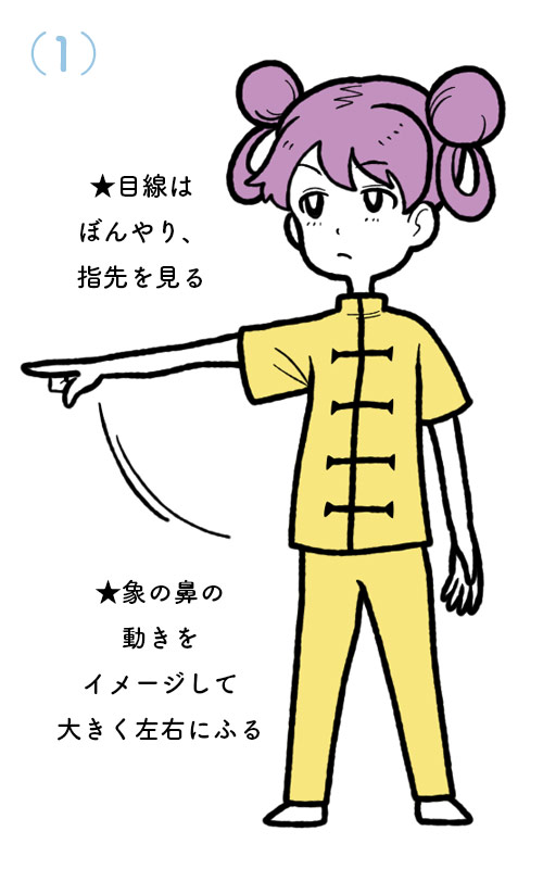 | 1) 片腕をゾウの鼻のように左右に大きく振り、指先をぼんやりと見つめる。 |