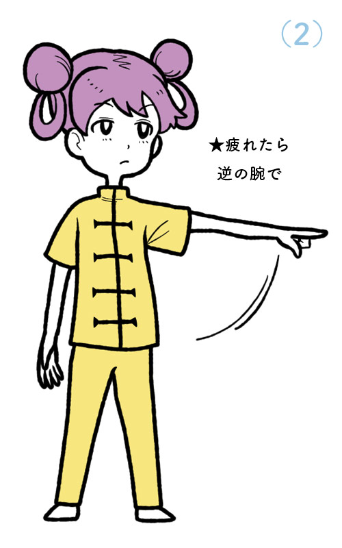 | 2) 無意識の動きにならないよう、腕を振りながら数を数える。 10まで数えたら、また1に戻る。このとき呼吸は意識しなくてOK。 腕が疲れたら逆の腕で行なう。 |