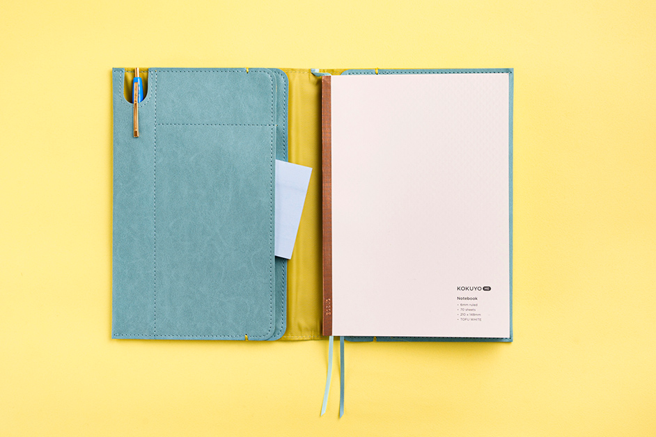 機能的でありながら、アクセサリーのように楽しめるデザイン性を兼ね備えた『KOKUYO ME』。こちらのシリーズから、A5サイズが入るノートカバーをセレクト。合皮素材でマットな質感のSMOKY SKY、GRAYISH BLAK、TOFU WHITEの3色がそろいます。表面は落ち着いたくすみカラーで、内側はビビットなカラーがちらり。大人の遊び心を感じる色使いです。