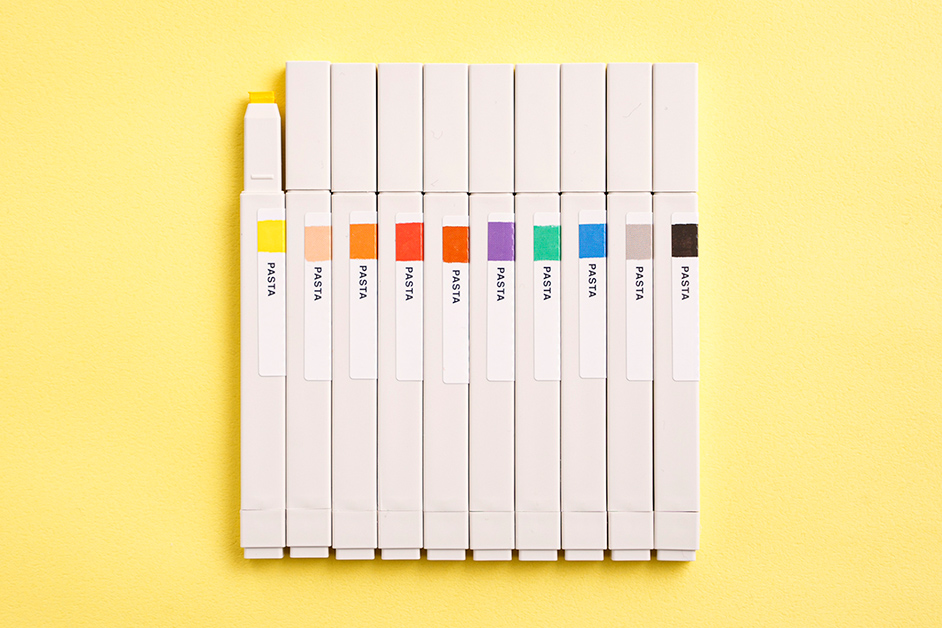 透明感のある鮮やかな発色と、なめらかな描き心地が楽しめる水性ゲルマーカーの「PASTA(パスタ)」。樹脂製のスタイリッシュなケースに入った繰り出し式の固形マーカーで、手を汚さずスムーズに描けます。細かい箇所でも塗りやすい四角形の芯は、便利なリフィルタイプ。濃淡をつけたり、重ね塗りをしたり……、自由自在に色を楽しめるなんて、いろいろアイデアが浮かんできそう。