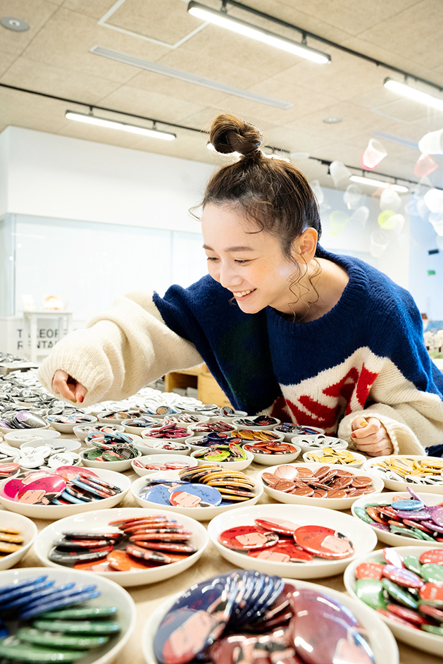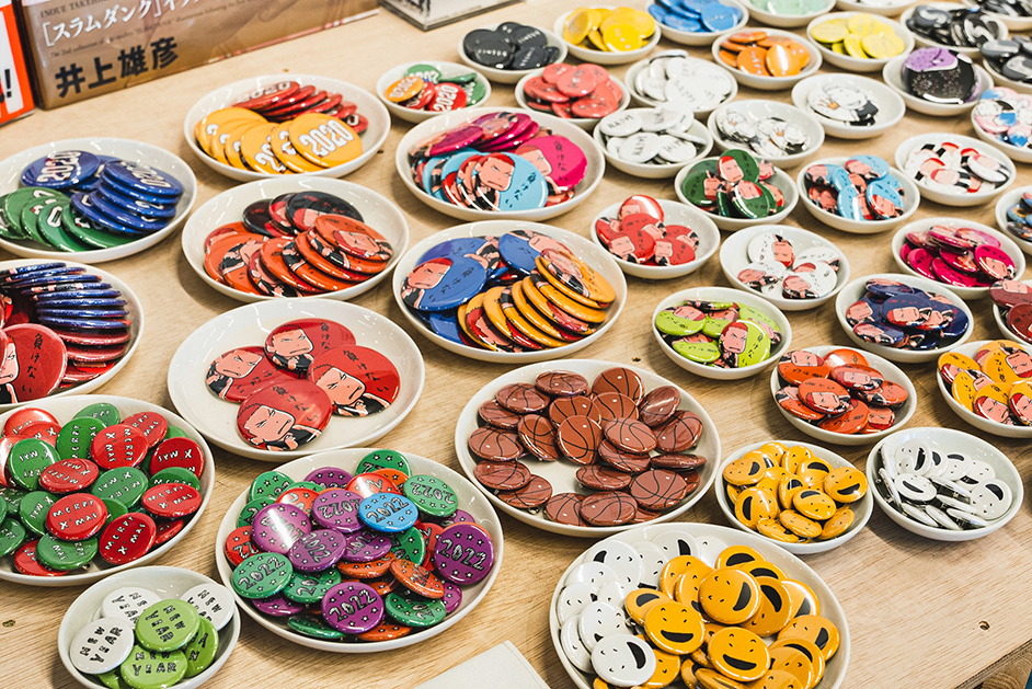 漫画家・井上雄彦さんとの協働プロジェクト「イノウエバッジ店」のコーナーも人気のひとつ。井上さんの代表作「スラムダンク」の主人公・桜木花道が描かれた缶バッジは、絵柄もカラーもサイズも豊富です。