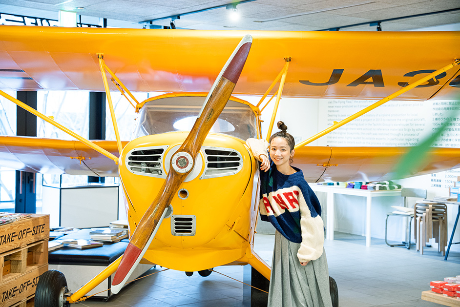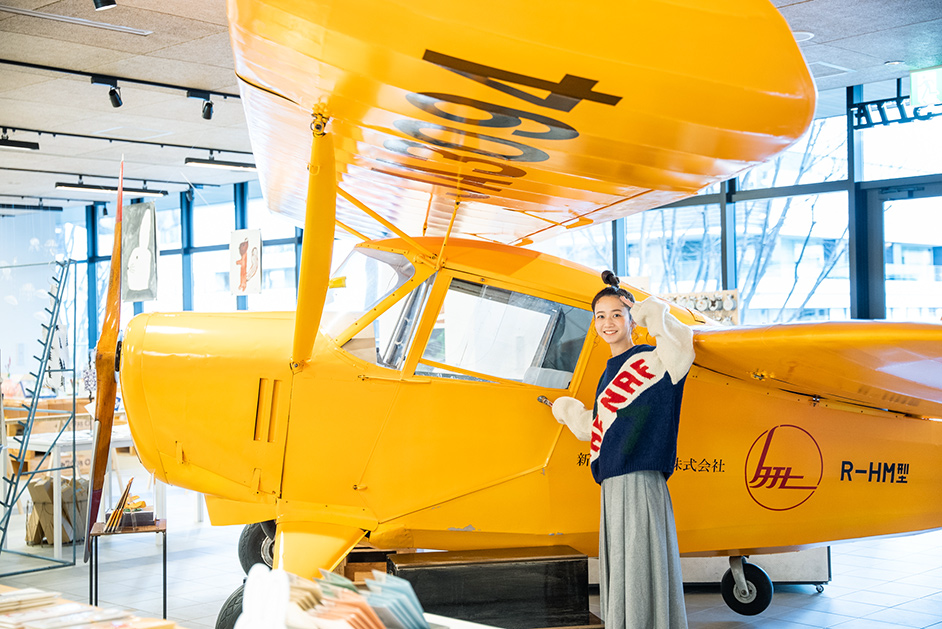 店内の奥に進むと、なんとイエローカラーの飛行機がお目見え!1950年代に作られた自家用にも使用できる軽飛行機「R-HM型」で、常時展示されているものです。自家用らしく、納屋に収納できるように翼が折れる仕組みになっているのだそう。店内では飛行機の模型など、オリジナルグッズも販売されていますよ。