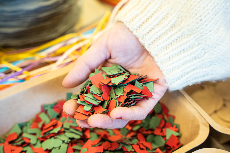 紙加工の会社ならではの端材は、形やカラーも豊富で、目移りしてしまいます。「カードはメモにも使えるし、小さいパーツを集めて工作しても楽しいですよね!」と気になる端材を真剣に計測。