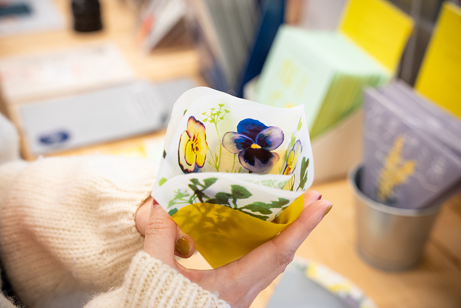 三角形の封筒をあけると薄紙の花束とメッセージカードが出てくる「花テガミ束」は、福永紙工主催の「ペーパーカードコンペ2020」の優秀賞受賞作を製品化したもの。ものづくりをする人たちを応援したいというお店の気持ちが込められたアイテムです。