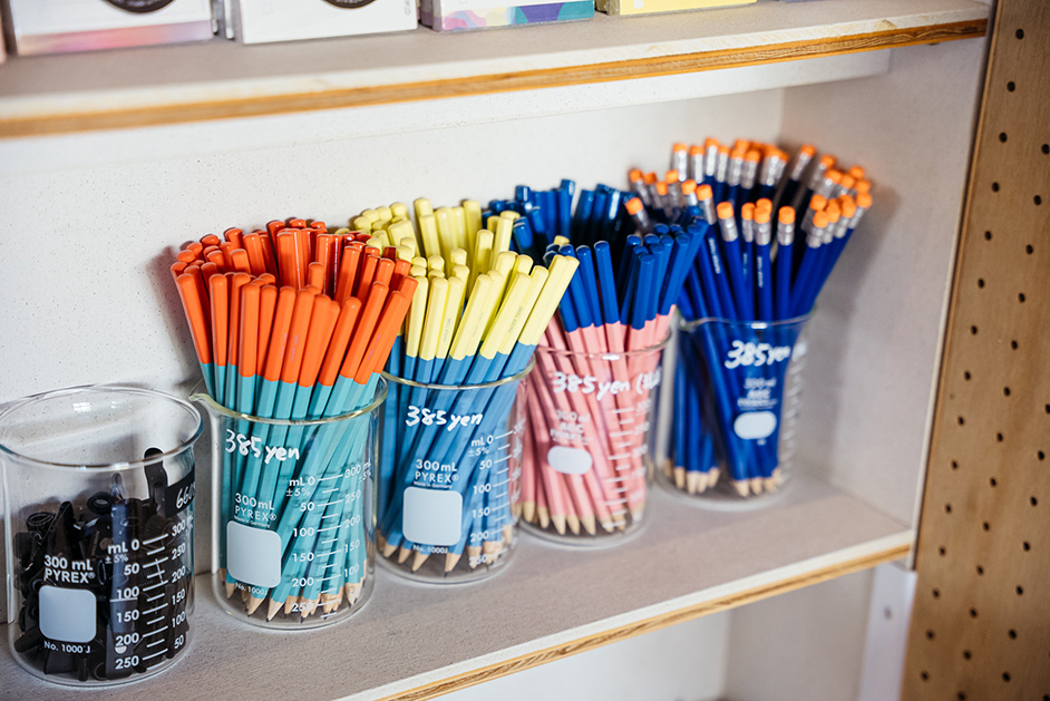 定番人気のボールペンやシャープペンシルはツートーンカラーのかわいい配色が特徴です。「日本ではあまり見ない色合わせですよね。原色だけでなく曖昧な色みがかわいいです!」。ペンケースに入っているだけで気分も明るくなりそう。