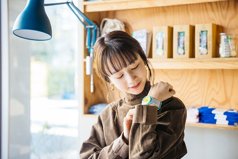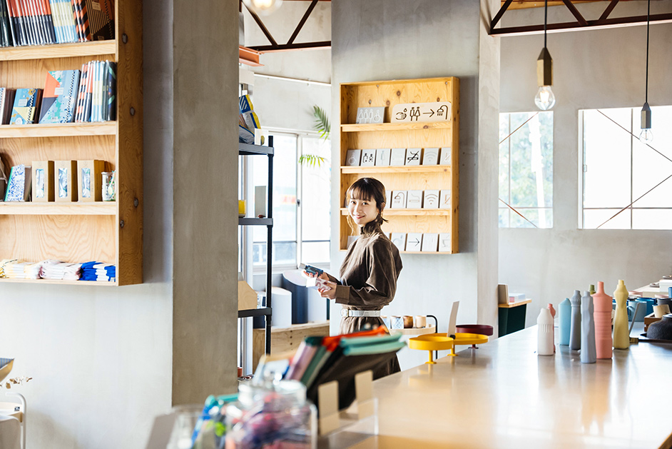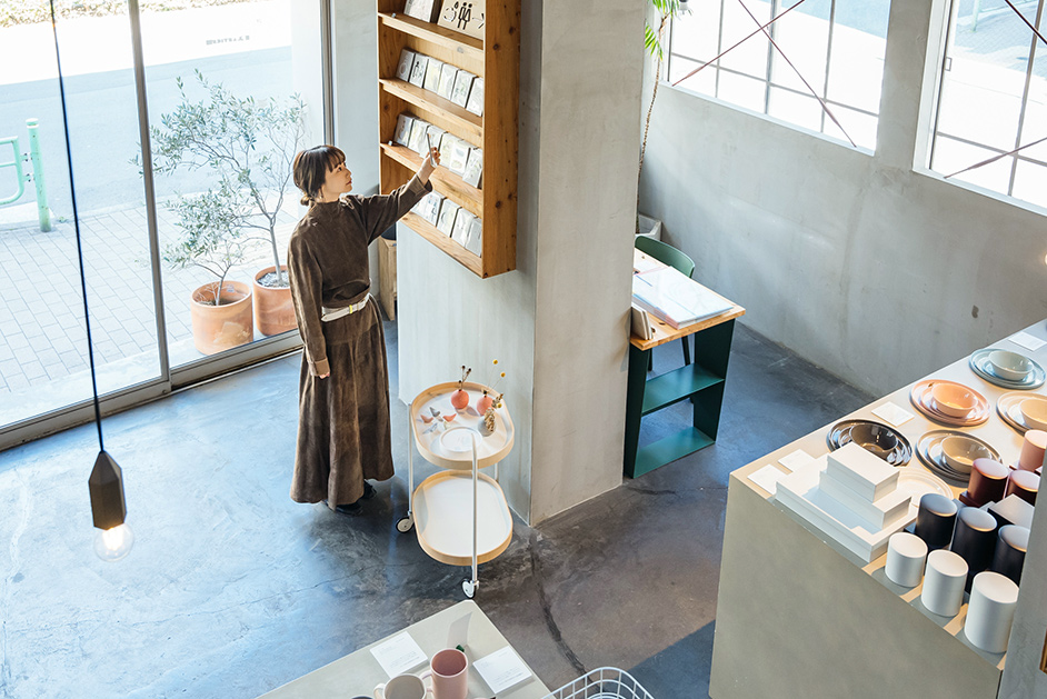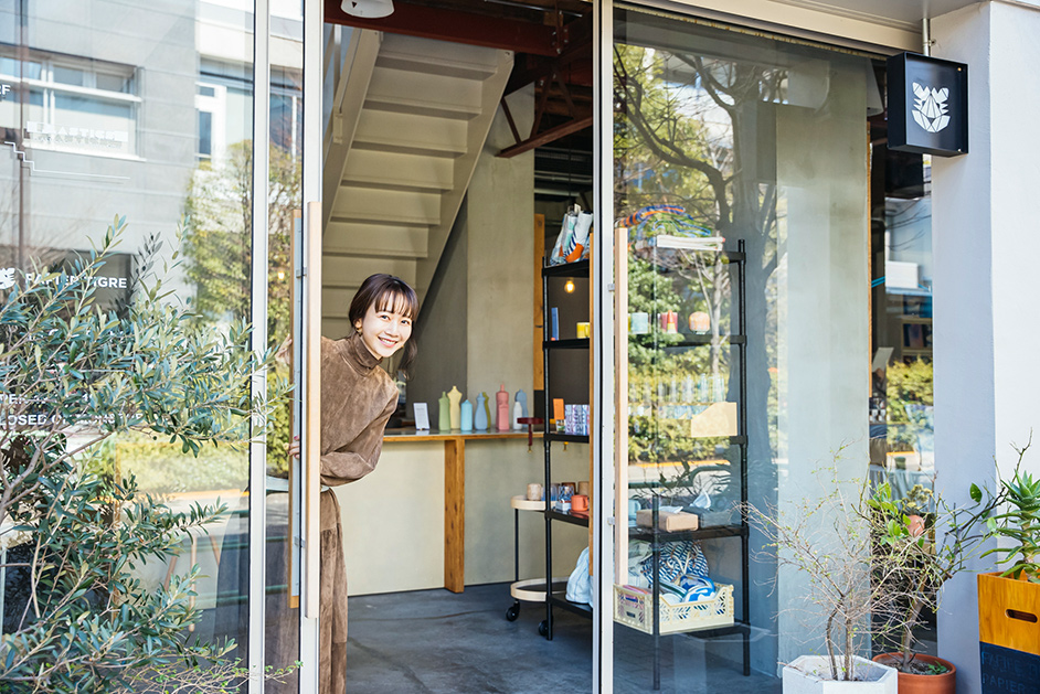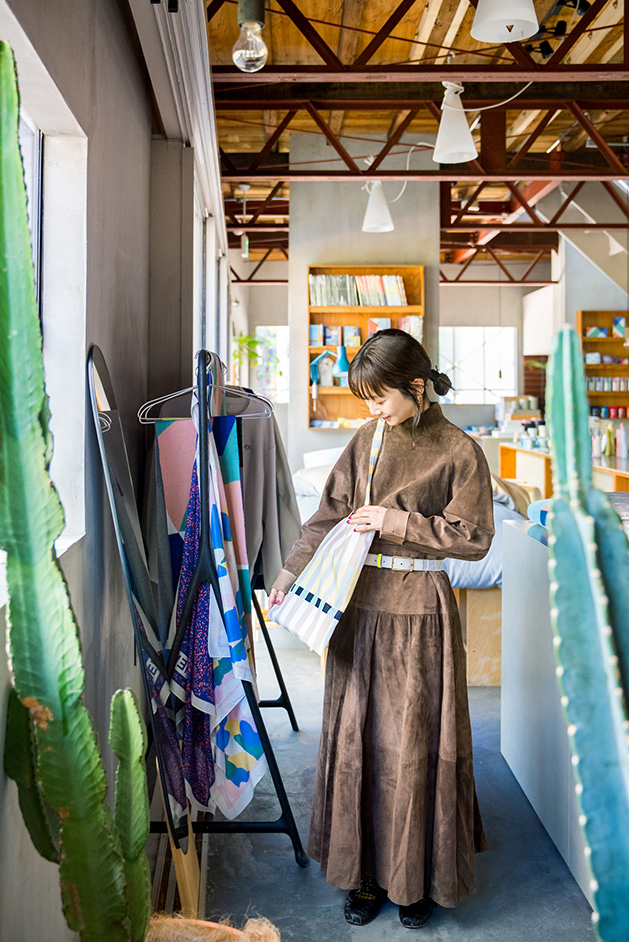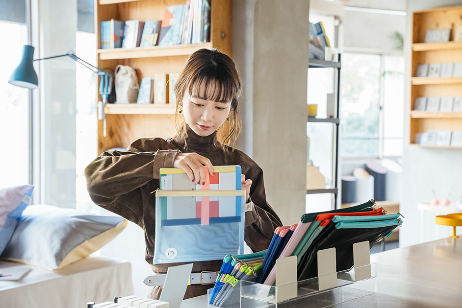 パピエ ティグルは以前から気になっていたお店だったという三戸さん「今回やっと来られてうれしいです!どのアイテムもカラフルなのに大人っぽくて、丁寧な暮らしに似合いそう。色の組み合わせも素敵で、製作者の方の色へのこだわりを感じます」。