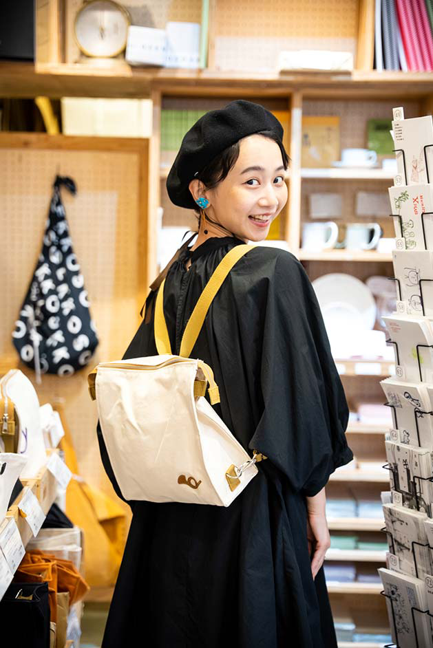 軽くて丈夫な帆布の布製バッグも大人気。形や色もバリエーション豊かで、画材の持ち運びはもちろん、日常のあらゆるシーンで活躍します。「ホルンのマークがかわいいし、中身も取り出しやすそう!」と三戸さんもお気に入り。