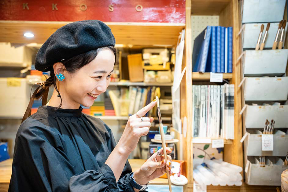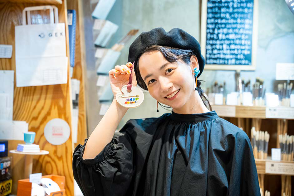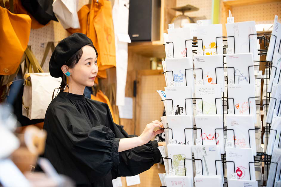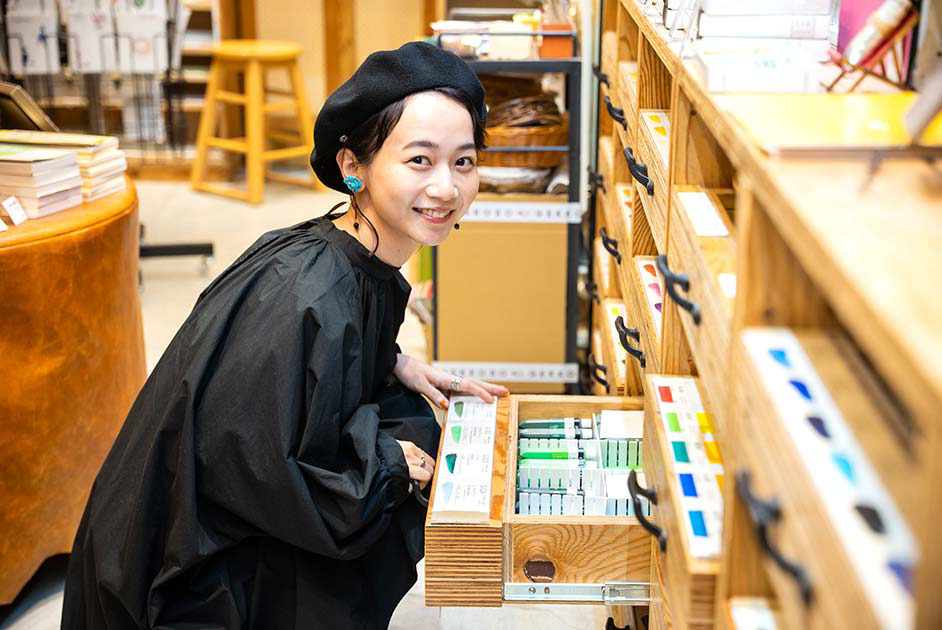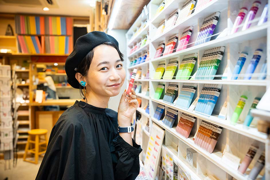 普段から絵を描くなど創作活動に勤しむ三戸さんは、始終店内のあれこれに興味津々。「ビルの入り口から少し奥まったところにあるので、入った瞬間から隠れ家のような世界観に浸れますね。カラフルな絵の具が並んでいて、すごくワクワクするお店です。絵の具も使えてのびのびと描ける試し描きコーナーでは、描くことや色の楽しさをたっぷり味わわせてくれます。ユーモアカードを一点ずつじっくりと眺めてクスッと笑えて、画材以外にも充実したアイテムがこの空間にギュッと詰まっているのでつい長居してしまいそうです」。