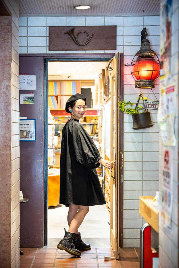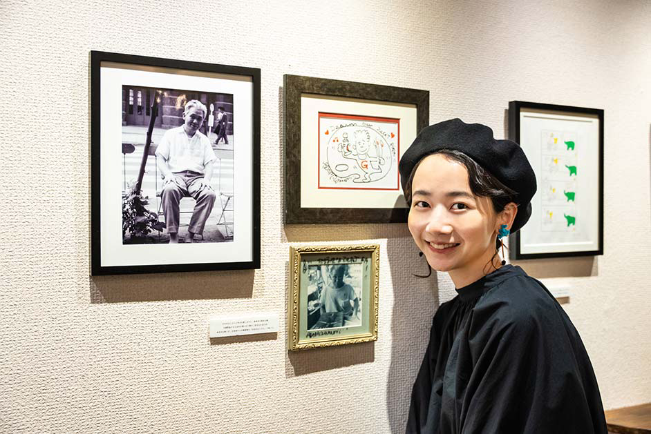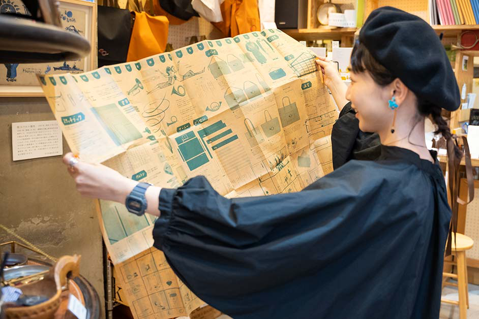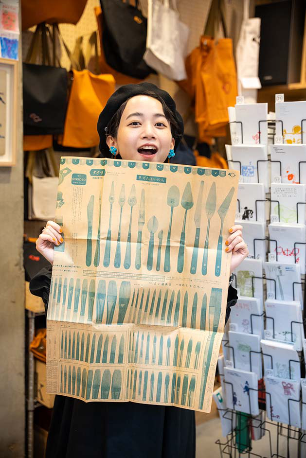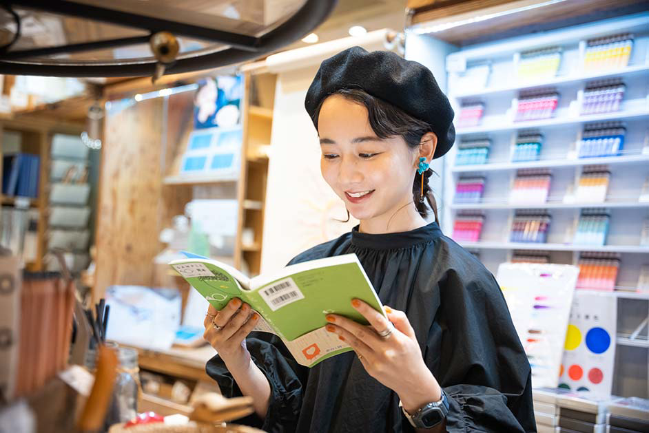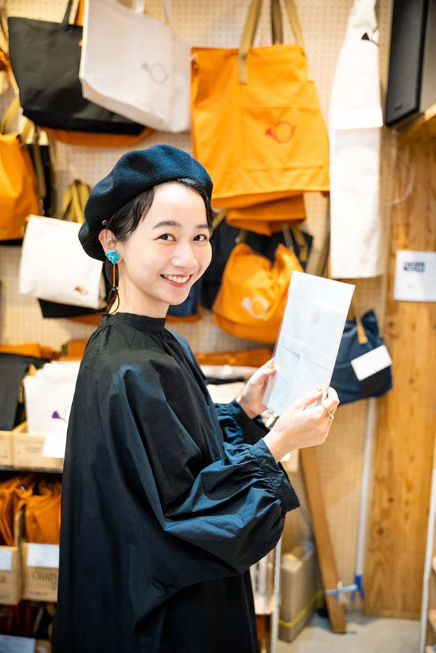 普段から絵を描くなど創作活動に勤しむ三戸さんは、始終店内のあれこれに興味津々。「ビルの入り口から少し奥まったところにあるので、入った瞬間から隠れ家のような世界観に浸れますね。カラフルな絵の具が並んでいて、すごくワクワクするお店です。絵の具も使えてのびのびと描ける試し描きコーナーでは、描くことや色の楽しさをたっぷり味わわせてくれます。ユーモアカードを一点ずつじっくりと眺めてクスッと笑えて、画材以外にも充実したアイテムがこの空間にギュッと詰まっているのでつい長居してしまいそうです」。