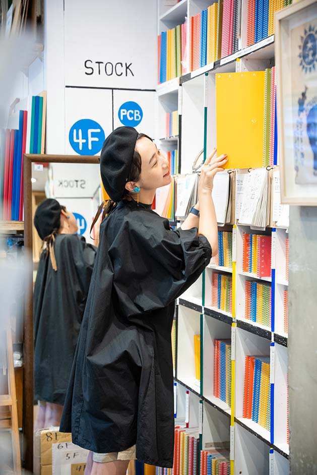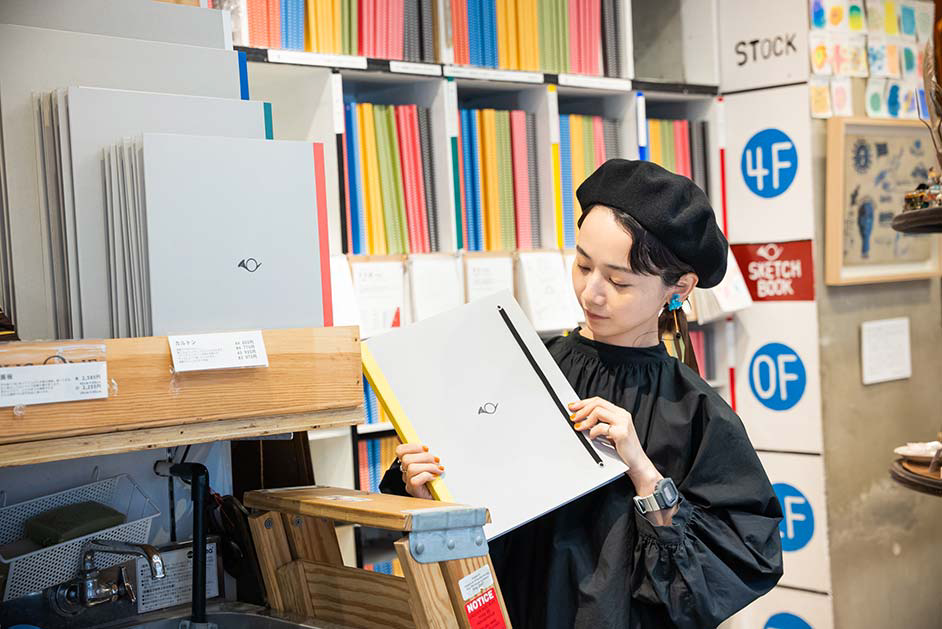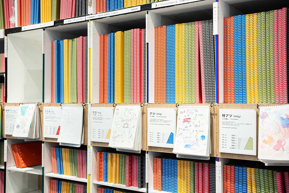 豊富な種類で、メモ帳、創作、デザイン用など人それぞれの楽しみ方が。リングが表紙の内側に収まっているのも特徴で、棚や鞄から出すときに引っかかりにくい仕様。ぎっしり詰まった店内の棚からもするりと取り出せ、使い勝手の良さを感じます。