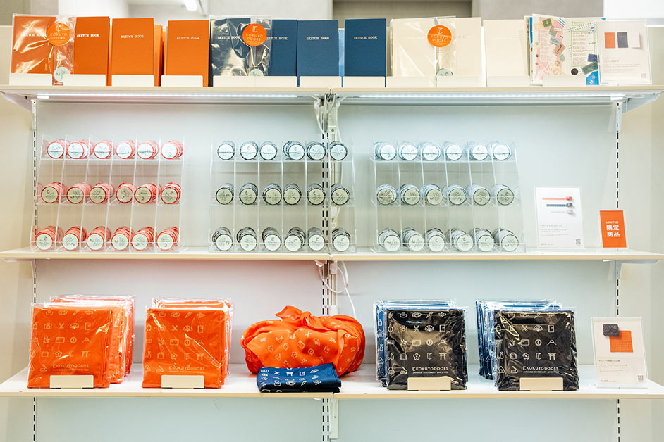 まず注目したいのは、KOKUYODOORSのオリジナルアイテム。マスキングテープや野帳など、旅にも連れて行きたいアイテムがそろいます。ショップのロゴや文具、旅や日本らしいアイコンがあしらわれていて、ホワイト、ネイビー、オレンジのカラーも和を感じる色合いに。