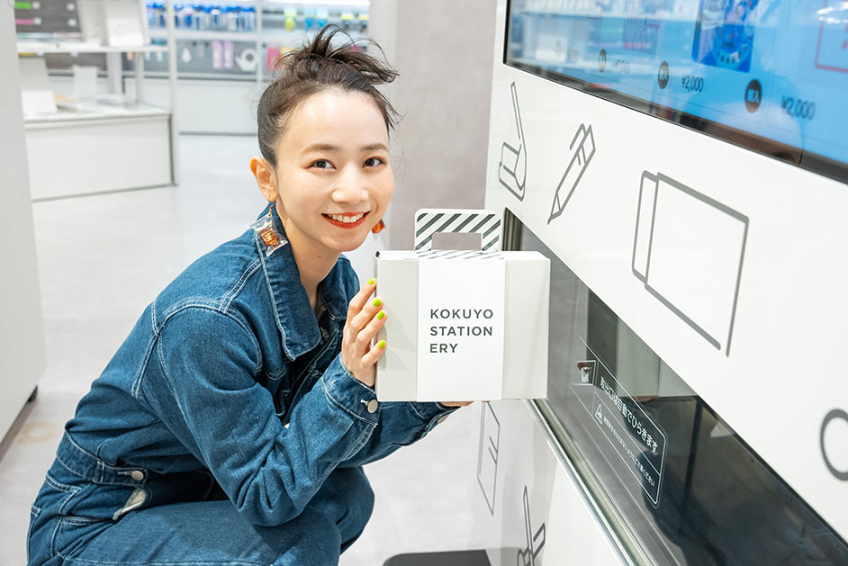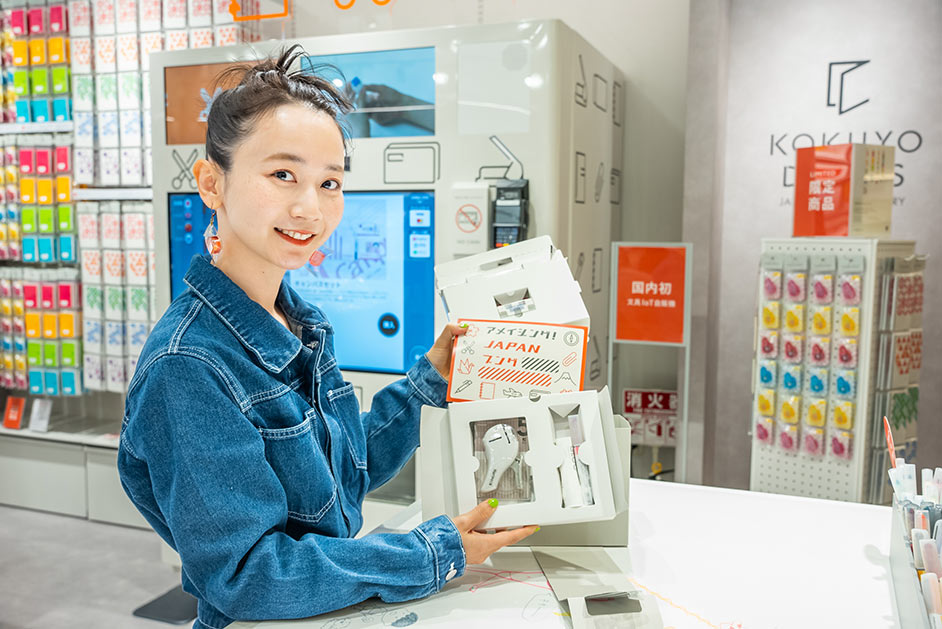 店内の目玉でもあるのが文房具のIoT自販機。デジタルサイネージとタッチパネル液晶で、文房具の画像や動画をしっかり確認することができるんです。