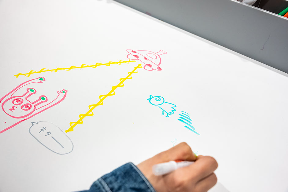 ペンの書き心地を試せる大きな用紙は、なんと工場直送のキャンパスノートの原紙ロール。コクヨ製品以外にもスタンダードな筆記具が用意されていて、キャンパスノートとの相性のよさを確認できます。三戸さんも伸び伸び試し書きを楽しんでいました。