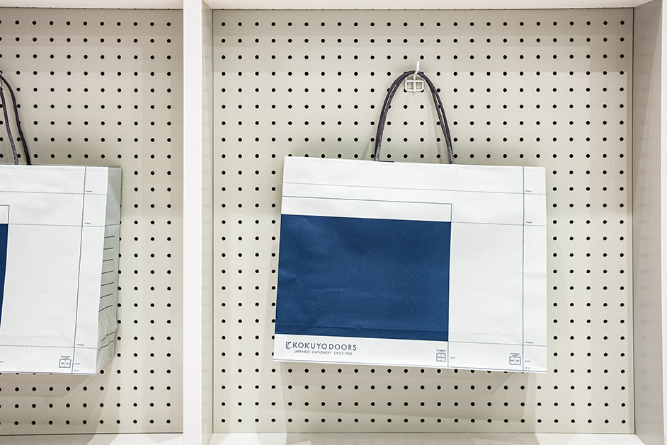 そして、KOKUYODOORSのショッパーにも注目を。紙袋タイプのショッパーは再利用が想定されたガイド付きのデザインになっていて、ファイルボックスやA5サイズのノートカバー、野帳カバーにリユースできます。スタイリッシュなデザインで使いやすいのも魅力的。