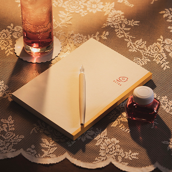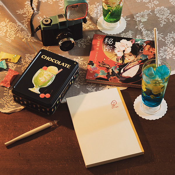 ノート専門店・TETOの「RETRO」は、ネーミングも花のイラストもかわいい!実は原稿用紙になっていて、物語や日記を綴りたくなる一冊。木製の持ち手がおしゃれなガラスペンは、福井県に工房を構えるスタジオ嘉硝のもの。7gと軽量で書きやすく、どんどんアイデアが浮かびそう。レトロなノートとペンの組み合わせで、小説家気分。