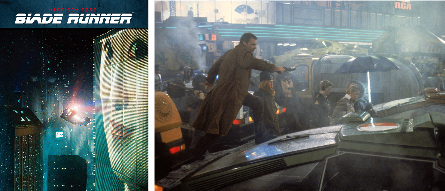 劇場公開:1982年/主演:ハリソン・フォード(デッカード役)/監督:リドリー・スコット/原案:フィリップ・K・ディック/音楽:ヴァンゲリス/特殊撮影効果:ダグラス・トランブル/ビジュアル・フューチャリスト:シド・ミード