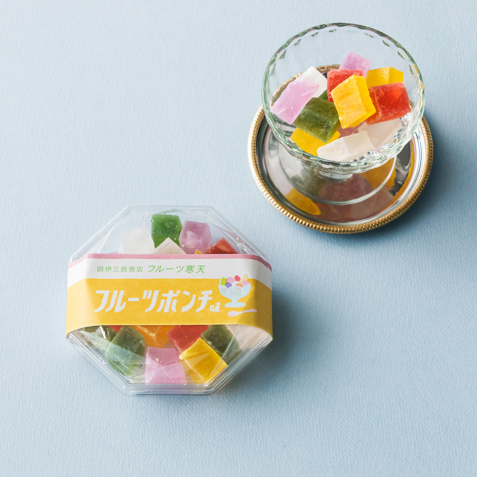 宝石のような愛おしさでキラキラときらめく琥珀糖。岡伊三郎商店が作り手の「フルーツ寒天」は、日本百貨店の中でも人気のシリーズです。その中のひとつ「フルーツポンチ味」は、まるで純喫茶やパーラーを思い起こさせるようなお菓子。