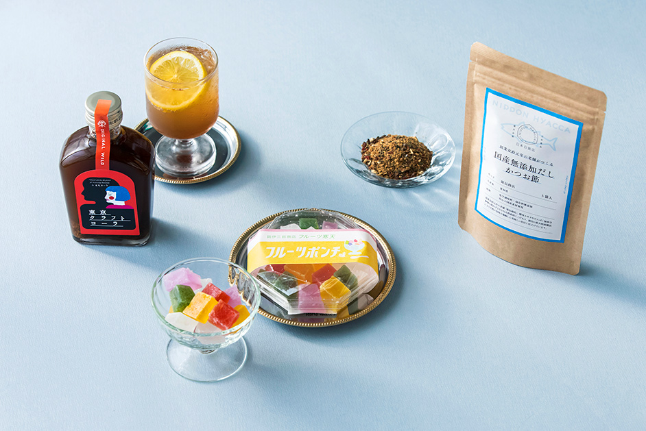 日本百貨店のアイテムは、「ニッポンの百貨をおもしろく。」というコンセプトにこだわり、多くのデザインは、日本文化、ユーモア、新編集、遊び、人間味という視点を活かすものになっているのだそう。今回セレクトしたのは、「東京クラフトコーラ」「フルーツ寒天 フルーツポンチ味」「国産無添加だし かつお節」の3点。日本百貨店こだわりのデザインにも注目してみてくださいね。