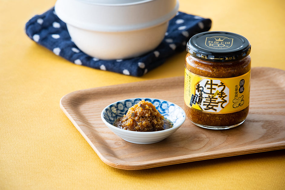 ユニークな商品名とインパクトのあるラベルデザインが目を引く瓶詰めは、福島県猪苗代町にある食品メーカーの生姜の加工食品。細かく刻んだ国産生姜をエゴマ入りのほんのり甘い醤油にじっくりと漬け込んだもので、蓋を開けた瞬間に生姜の爽やかで刺激的な香りが漂います。
