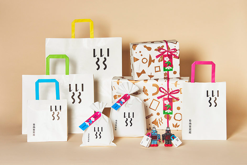 日本百貨店では、オリジナルの手提げ紙袋、ラッピングも用意。日本百貨店のロゴをあしらった手提げ紙袋はサイズによって持ち手のカラーが異なるデザインに。ギフトラッピングの包装紙は日本らしいアイコンが散りばめられています。ぜひ活用してみて。