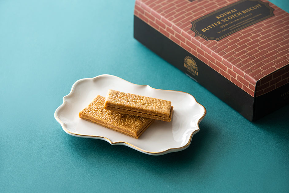 「バタースカッチビスケット」は、エキュート東京店の限定品。小岩井伝統の醗酵バターとカソナード(赤砂糖)で作ったバタークリームを、しっとり食感のキャラメルビスケットでサンド。口の中で広がる、バターの濃厚さとキャラメルの苦みにおいしい余韻が残ります。東京駅丸の内駅舎の赤レンガをイメージしたシックなパッケージも特徴で、大人の手土産として活躍してくれそう。