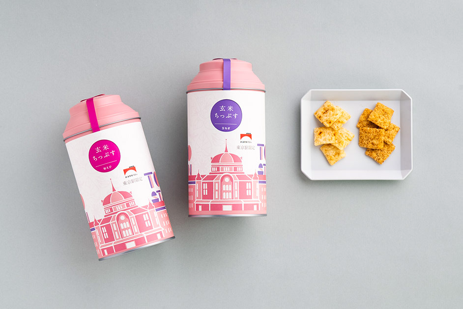 「玄米ちっぷす」は、宮城県加美町産のもち米・みやこがね玄米100%の生地を米油でカラッと揚げたもの。ひと口サイズで食べやすく、噛むほどに玄米の香ばしさが広がります。フレーバーは桜えび、玉ねぎ、パルミジャーノレジャーノの3種。無香料、無着色で素材の風味やうまみがそのまま。スタンド袋や、東京駅限定パッケージ付きも選べる缶入りがそろうので、好みの組み合わせでお土産にするのもおすすめ。