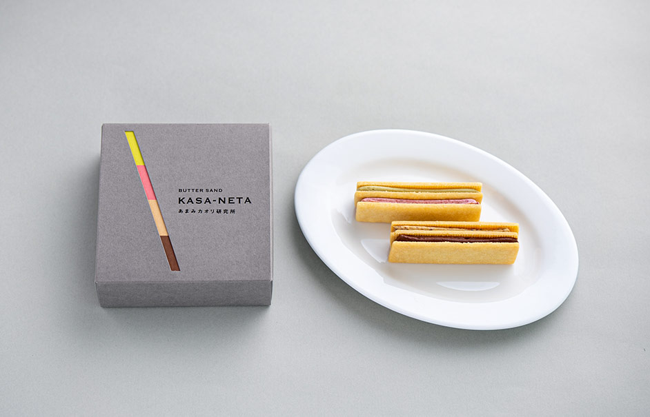 おいしい食の掛け合わせ“マリアージュ”をお土産にできるのが「KASA-NETA」。5層になった美しい彩りのバターサンドです。ほろりとしたサブレに挟まれているのは、ピスターシュ×フランボワーズと、ラムレーズン×ショコラのバタークリーム。風味豊かなサブレと、それぞれのクリームのコクや酸味が織りなす三位一体のおいしさが楽しめます。バタークリームの色彩がアクセントになったスマートなパッケージも魅力的。