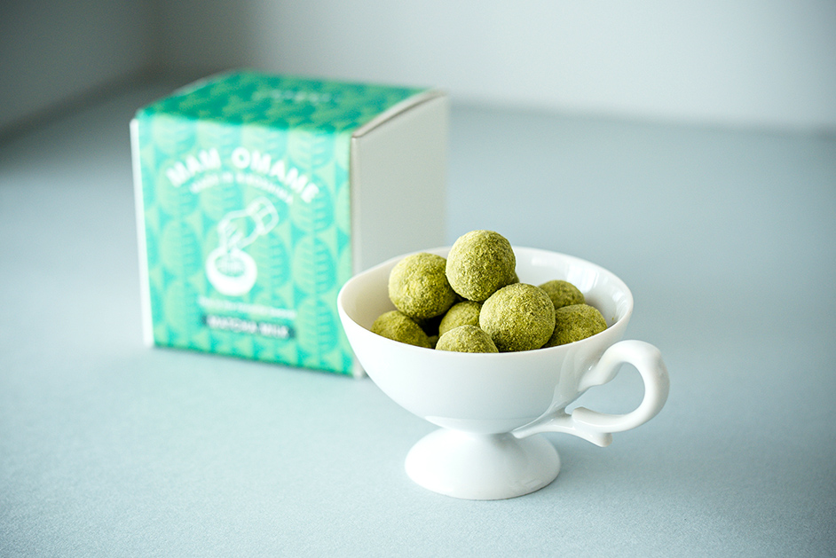 そのひとつが「MATCHA MILK」。老舗の伝統を引き継いだ広島県の豆職人たちが、豆をひと粒一粒生地に包み、丁寧に煎りあげていて、香ばしくカリッとした歯ごたえ。抹茶のほろ苦さとミルクの甘みが絶妙なバランスで、手が止まらなくなります。パッケージはグリーンがベースで、お茶をたてているところがイラストに。ちょっとしたギフトにも喜ばれそう。