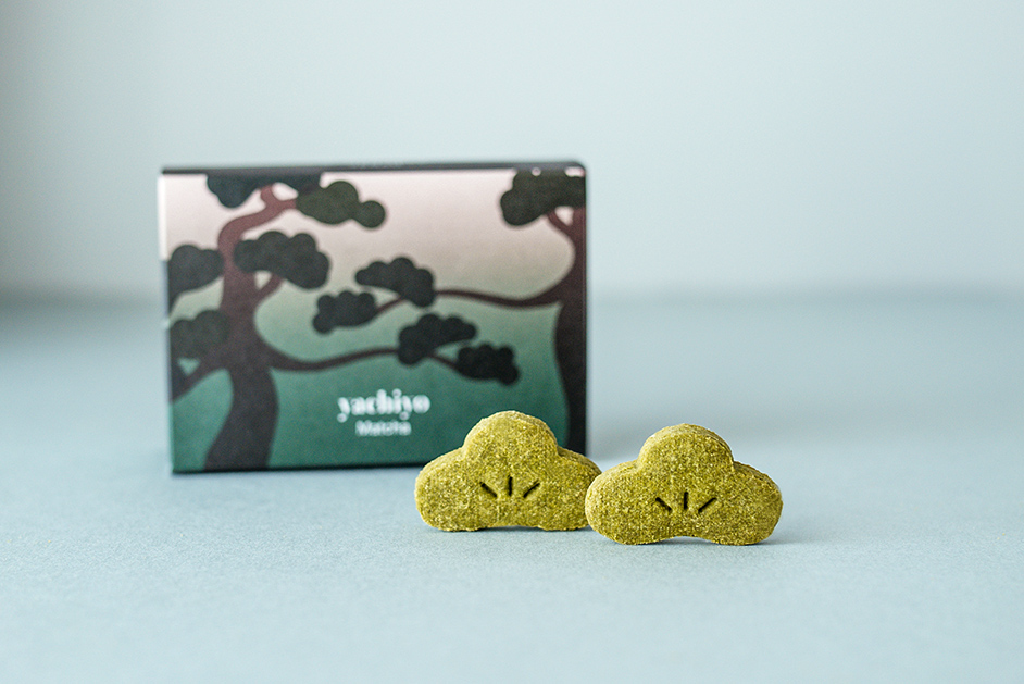 「やちよ」は有機米粉と有機メープルシロップをベースに、全国から選りすぐった自然栽培の食材で作る和のクッキーシリーズ。松の形が風情たっぷりの「抹茶」は、片栗粉や抹茶も有機栽培ものを使用。口の中で優しく崩れ、ふわっと漂う抹茶の香りにも癒されます。