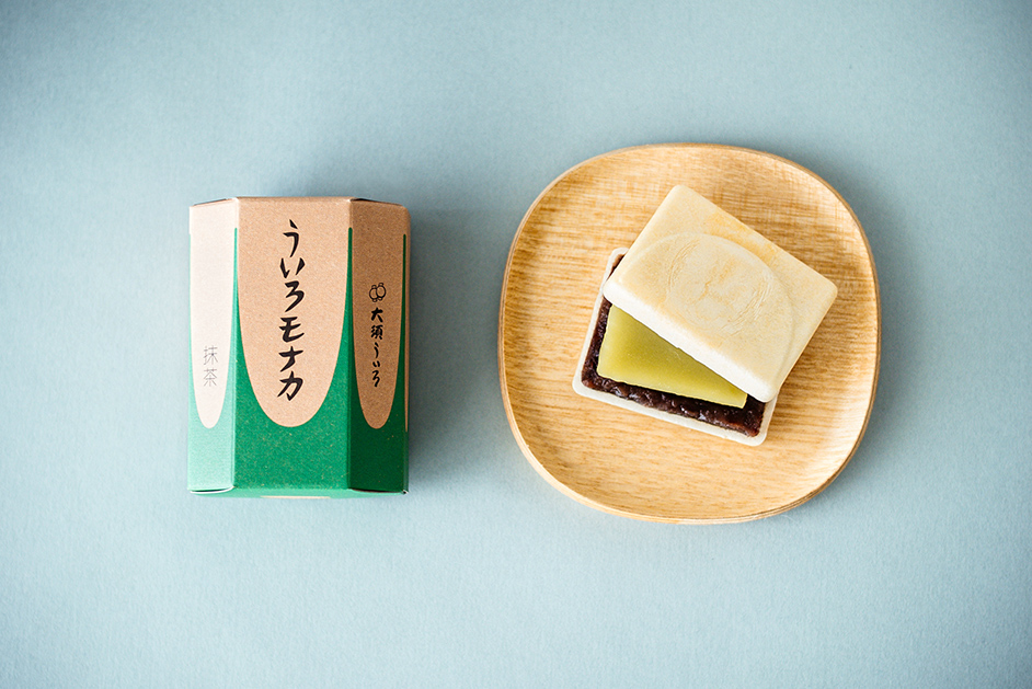 レトロな趣のロゴと八角柱のBOXがかわいい「ういろモナカ」も、新しいスタイルのういろとして考案されました。味わいは全3種。深いグリーンが印象的なこちらは、抹茶ういろのモナカ。米粉の甘みと抹茶の爽やかな風味を生かしたういろは、もちっとした優しい口当たり。じっくりと炊きあげたあんこ、サクッと香ばしいモナカ皮の異なる食感を楽しみながら、三位一体のおいしさを堪能できます。モナカ皮にあんことういろを自分で挟んで味わう、食べるまでのプロセスも楽しんで。