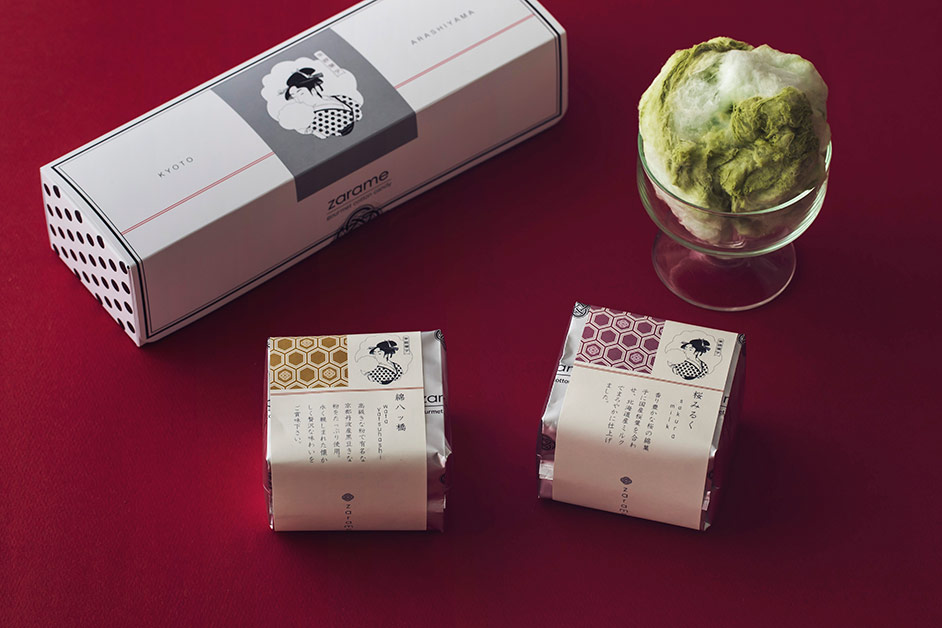 綿菓子というと砂糖のみのシンプルな味わいを想像するけれど、zarameでは、丹波産の高級黒豆きな粉、宇治抹茶など、京都ならではの素材を使ったフレーバーがそろいます。しゅわっとやさしく口どける繊細な京綿菓子で、雅な気分になれるかも。浮世絵をモチーフにしたパッケージも和を感じさせて◎。