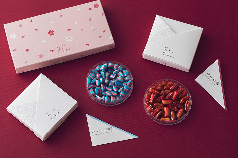 京都のお土産 京あめ クロッシェ「シェルブールの雨傘」「唐紅山吹」