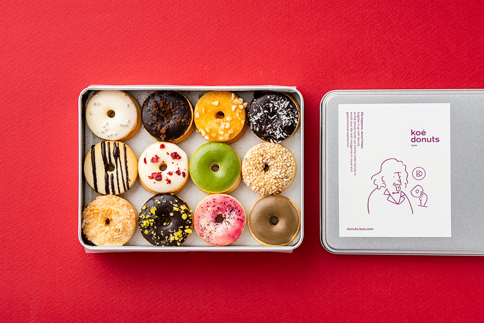ファッションブランド「koe(コエ)」が運営する「koe donuts kyoto」。こちらで人気なのが、ドーナツがモチーフとなった見た目もかわいい「koe donuts クッキー缶」。店頭で販売されているドーナツをイメージしてトッピングを施した12枚と、プレーン12枚の合計24枚入り。