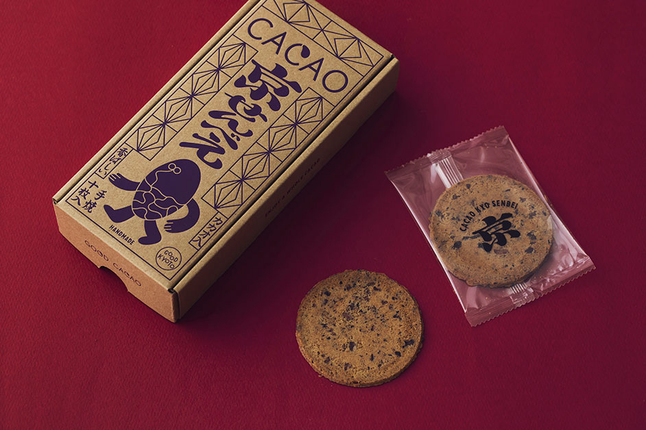 伝統の製法で職人が一枚一枚焼き上げ、古代小麦など、滋養ある素材の風味を活かした京煎餅は、パリッとした心地のよい食感と素朴な味わいが特徴。カカオのキャラクターとクラフト感のあるパッケージも魅力的で、センスのある京都のお土産になりそう!