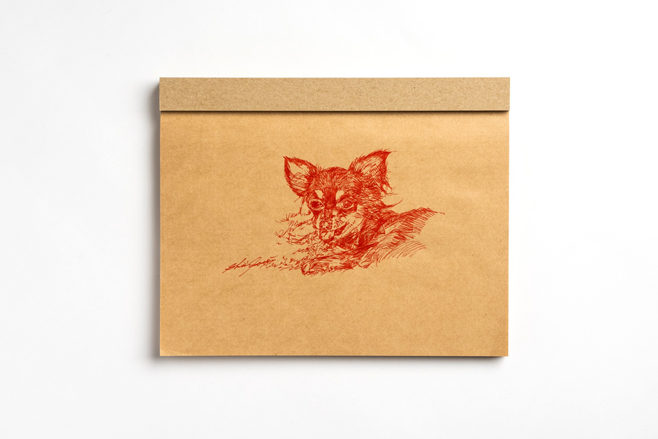 佐藤 この紙質がメモになって出回っているところにあまり出会ったことがなく、描いてみたらどうなるのだろう?と興味があり選んでみました。ペンはオレンジ色にすることで、より紙とマッチするのではないかと思い、この色で描いています。選ぶペンの種類によっては滲んだりしてしまう紙質かな?と思っていたのですが、インクとの紙なじみがよく、こちらも描きやすかったです。そして、最近飼い始めた愛犬を描きました!この絵をもって、愛犬の絵は“初描き、デビュー”です。かわいすぎる!と連呼しながら描き終えました。