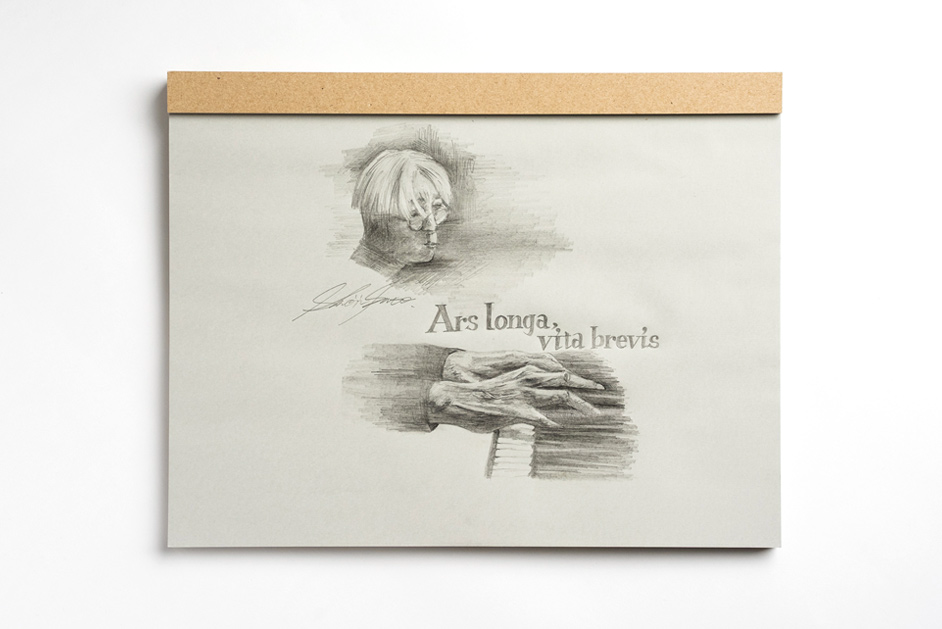佐藤 メモパッドのデザインのかわいさと白い大きな画面が描きたいものとマッチすると思って選びました。大きい白い画面に鉛筆で描くという、「予備校時代を思い出すような描き方ができれば!」と思って、道具は鉛筆をセレクト。やはり、白い画面と鉛筆との相性は言わずもがなよかったです。普通の紙に書くよりも決まるな、かっこいいなと思いました。テーマですが、偉大で美しいものは儚さと隣り合わせだなと痛感した、坂本龍一さんの美しく儚い瞬間を絵にしました。どうかいつまでも、この瞬間が残り続けてほしいです。
