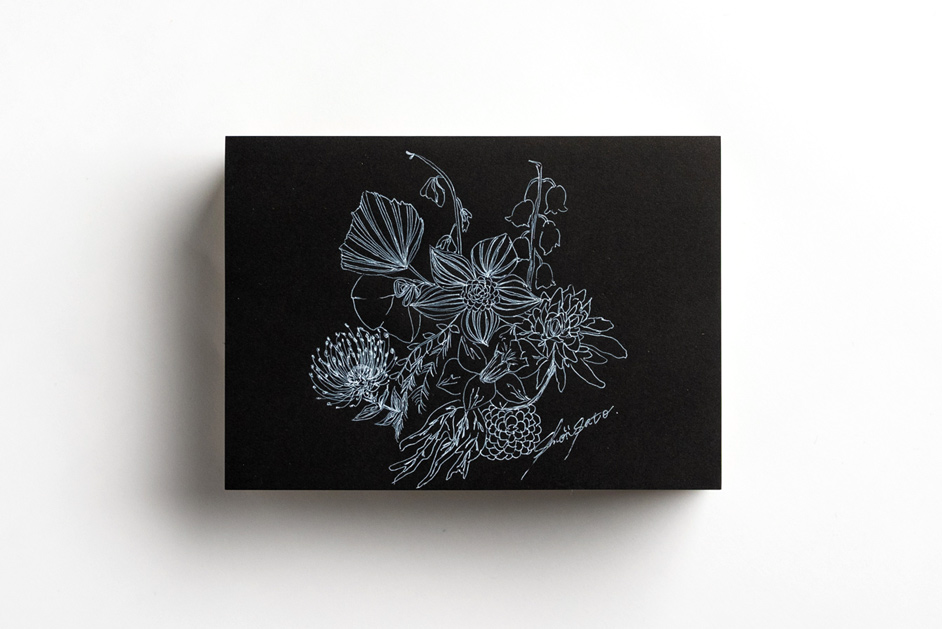 佐藤 黒のメモブロックはなかなか出会ったことがなく珍しかったのと、ひとつのメモブロックとしてもかっこよかったので選びました。普段花のペン画を描くことがいちばん多いです。今まで、白い紙、iPad……、いろいろなもので描いたことがありましたが、黒い紙に白いペンで描いたことはまだなかったので、初めての体験になりました。黒の紙に白いペンで描くことで、“普通に花を描くよりもあうのでは?”と思って使用してみたのですが、白いペンと細い線が映える紙質でとても描きやすかったです。