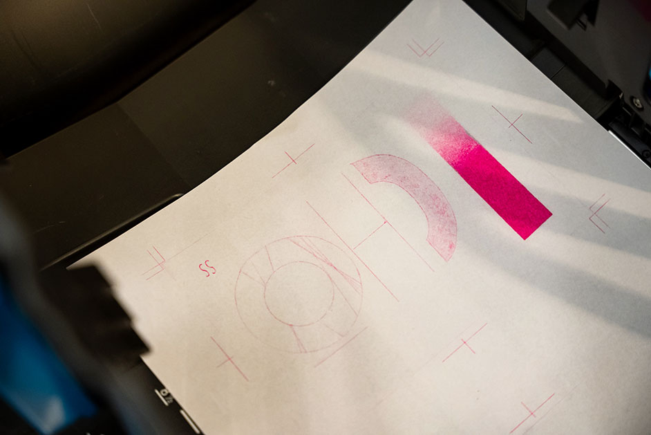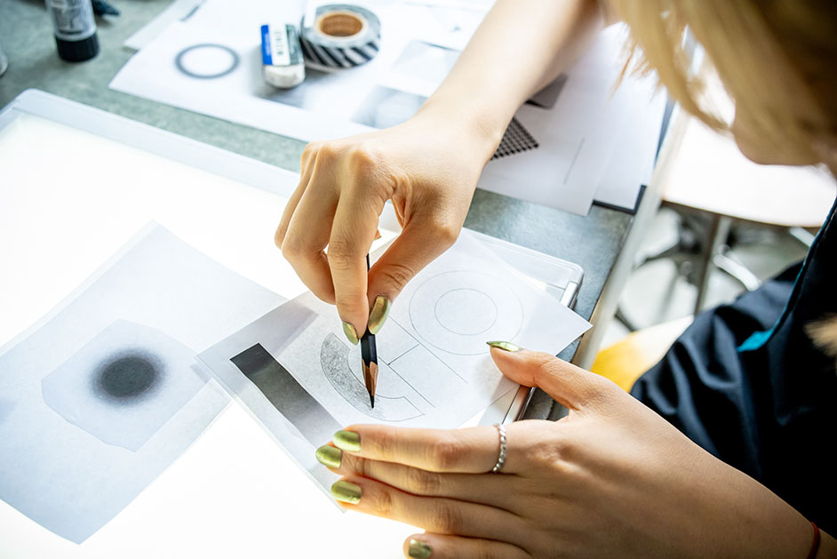 佐藤 ふぅ、思わず熱中していました! 原稿は、テンプレートや鉛筆などを使って「ICHO」と書いた版、魔神のイラストの版、円の図形の版の3版を作りました。