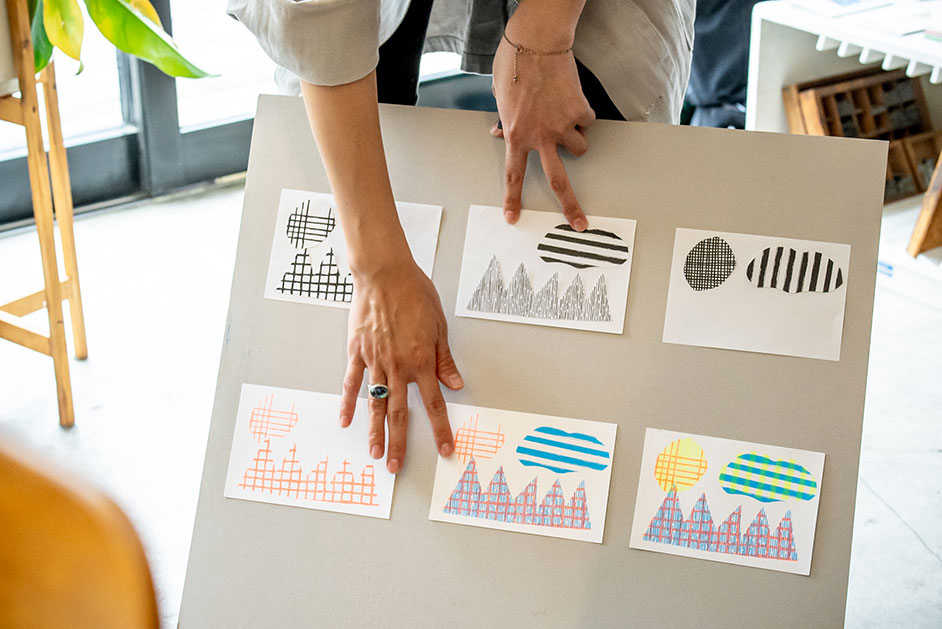 猪飼 今日は、版ごとにインキの色を選んで多色刷りを楽しんでいただこうと思っているのですが、色同士は透過して重なって混色します。つまり、黄色の版と青い版が重なると緑になるということです。ただ、原稿は白黒で描いていただくので、頭の中で色の重なりのイメージを持っていただくことがポイントですね。ここからはスタッフの内間さんがお手伝いします。