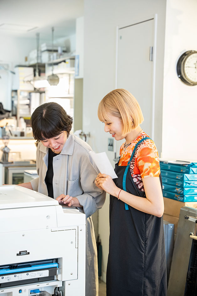 PRINT + PLANTのオーナーであり、デザイナーの猪飼俊介さんと、スタッフの内間あやめさんにご指導いただきながら、版ズレやかすれなどレトロな風合いが人気のリソグラフにも初挑戦しました。体験前には「不安半分、楽しみ半分」と自信なさげに話す佐藤さんでしたが、挑戦の結果やいかに?